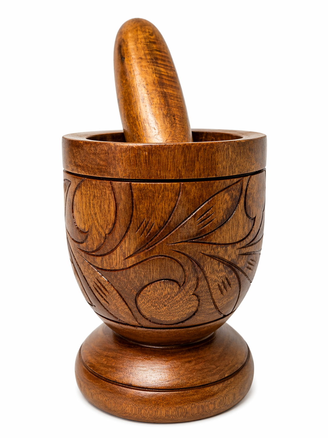 High Quality, heavy weight mortar and pestle. Handcrafted in Haiti. Great for extracting flavors from herbs and adding decor to your kitchen. This large wooden mortar & pestle that can make a great statement piece.